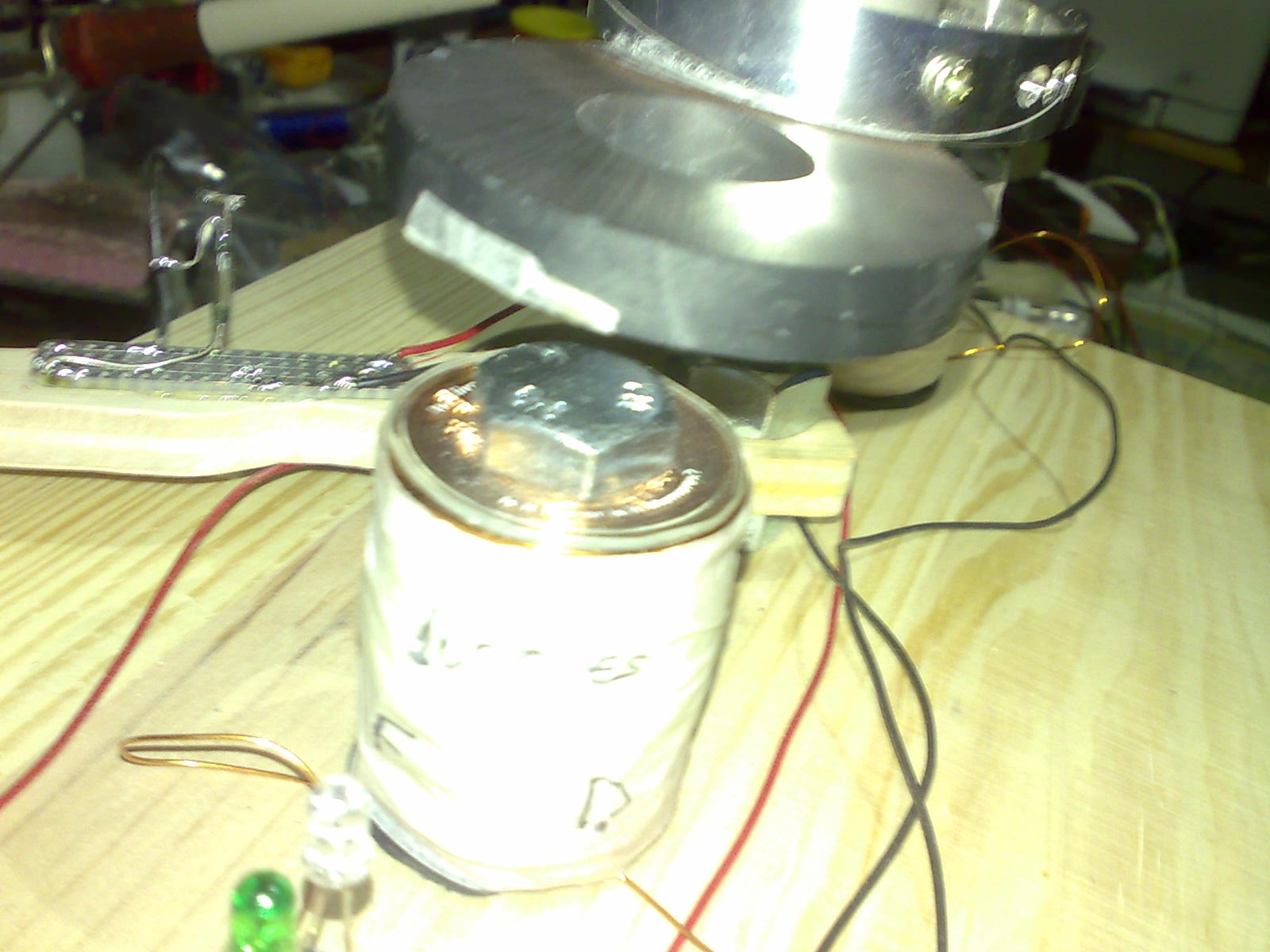 Note that the stator magnets all have their North faces upward, and that they are resting on a high magnetic permeability support plate that helps concentrate the force fields. Tenga en cuenta que todos los imanes del estator del Norte tienen sus rostros hacia arriba, y que reposen en una alta permeabilidad magnética placa de soporte que ayuda a concentrar la fuerza de los campos. The best gap between the end poles of the armature magnet and the stator magnets appears to be about 3/8 inch. La mejor diferencia entre el final de la armadura de los polos magnéticos del estator y los imanes parece ser de unos 3 / 8 pulgada.